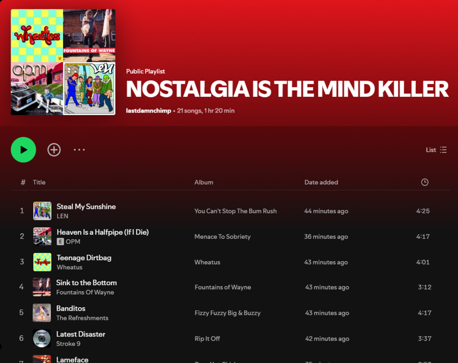 Anyway, instead of meticulously dropping information about every single song and band like usual, I genuinely just want you to imagine a scene. This is a very specific vibe — one that will never be captured again. Most of the folks who can taste it have passed that magical milestone of 30. At this point in our lives, nostalgia is the mind killer.