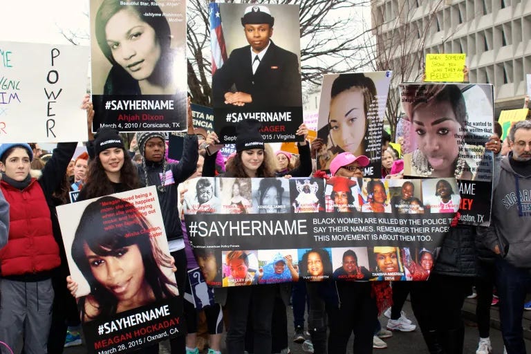 “Say Her Name” didn’t fall out of the sky as a generic phrase for “a woman died.” It was built — on purpose — by Black scholars and organizers to confront a specific kind of erasure: the way Black women, girls, and femmes are harmed by state violence and then disappear from the story. #SayHerName was created to resist the invisibility of Black women in conversations about police violence, because even inside movements for justice, we were still being edited out.