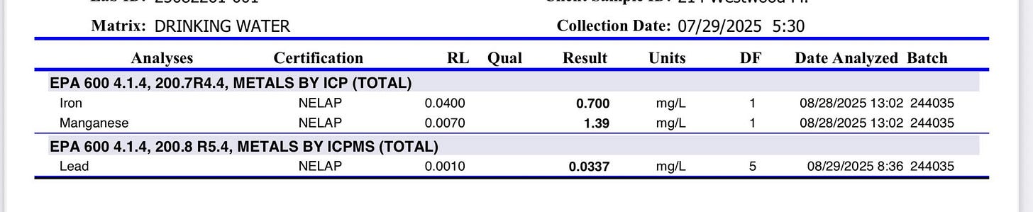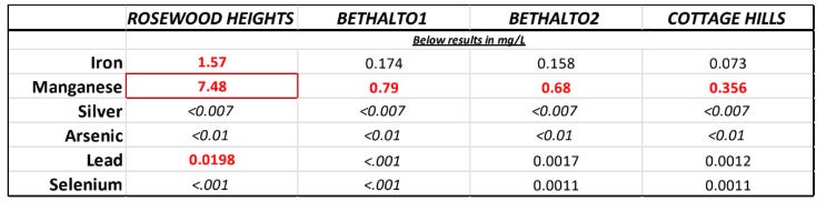Additional testing released to Sunken Press today from Shaun Flatt, one of the citizens in a coalition for clean water in Bethalto, shows concerning levels of both lead and manganese west of 9th Street Hill in Rosewood Heights. This is the sixth sample tested by independent citizens. Like the rest, it shows unhealthy levels of manganese.